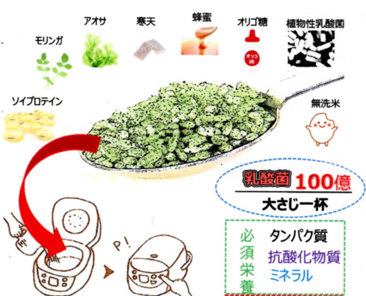【概要】特許技術で米を蜂蜜、オリゴ糖、ソイプロテイン、モリンガ、アオサ、寒天、植物性乳酸菌で加工融合した、消化吸収性に優れた栄養&腸活サポート米です。