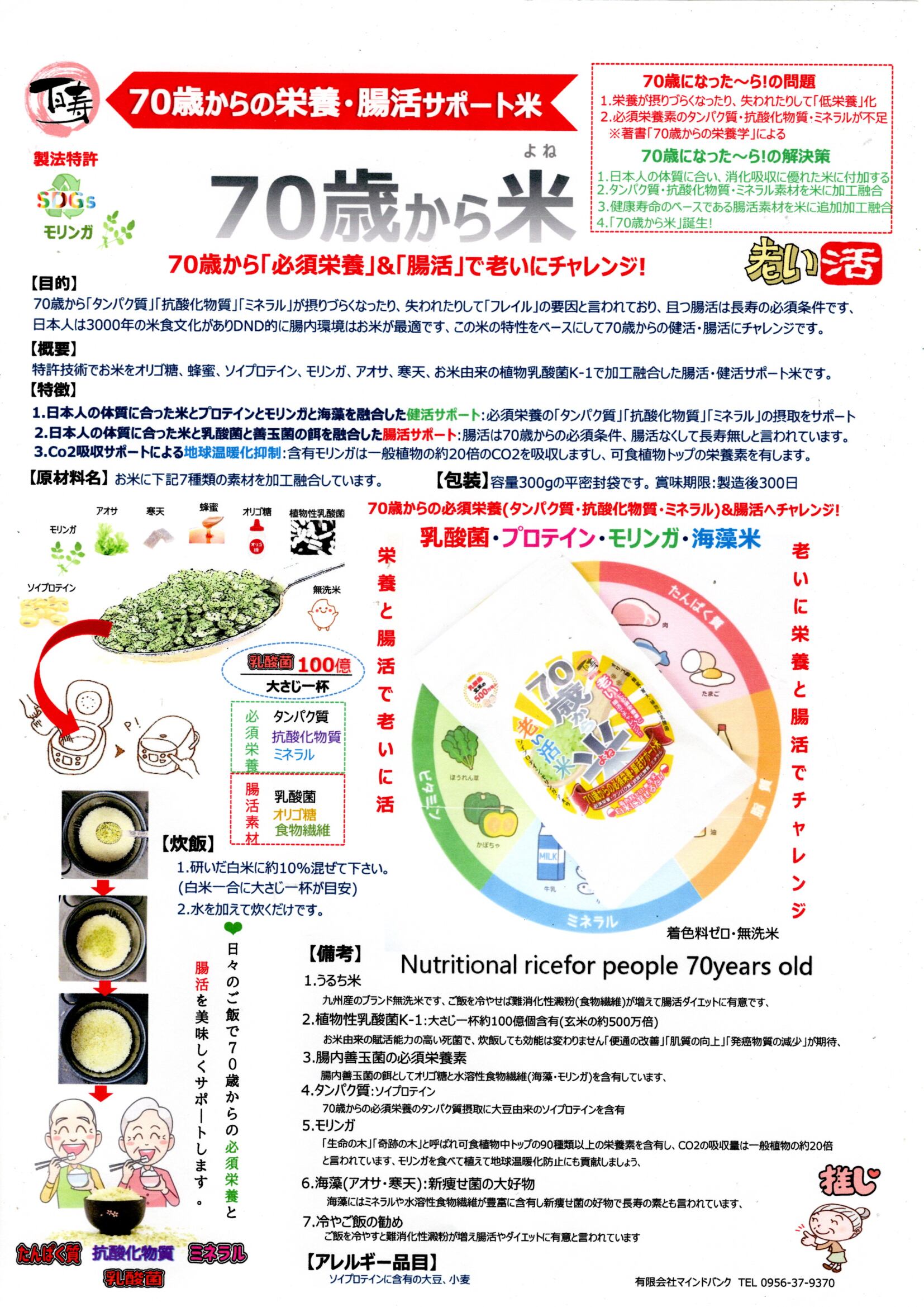 そこで3000年の米食文化があり日本人の体質や腸内環境に最も適合し、消化吸収率も98%と優れた主食の米に70歳からの必須栄養素材や腸活素材を加工融合すれば効率良く継続的に摂取できると考え「70歳から米」の開発に至りました。